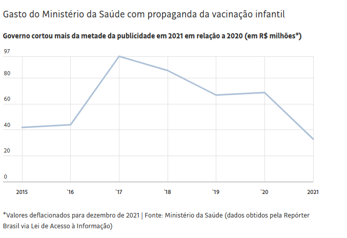 Diante das dificuldades já trazidas pelo coronavírus, o governo Bolsonaro ampliou o retrocesso. No ano passado, a pasta comandada por Marcelo Queiroga reduziu em 52%, em comparação a 2020, o orçamento das campanhas de gripe, sarampo, poliomielite, vacinação geral e febre amarela. Se comparada a 2017, a queda foi ainda maior: em 2021 chegou a apenas um terço do valor, como mostra o gráfico abaixo. Entre as maiores quedas, segundo dados do Plano Nacional de Imunização (PNI), estão a da vacina tríplice (contra sarampo, caxumba e rubéola), que em 2015 chegou a 96% das crianças e já despencou para 71%; a da prevalente (difteria, tétano, coqueluche, hepatite B e hemófilo B), com queda de 96% para 68%; e a da poliomielite (ou paralisia infantil), que foi de 98% a 67%.