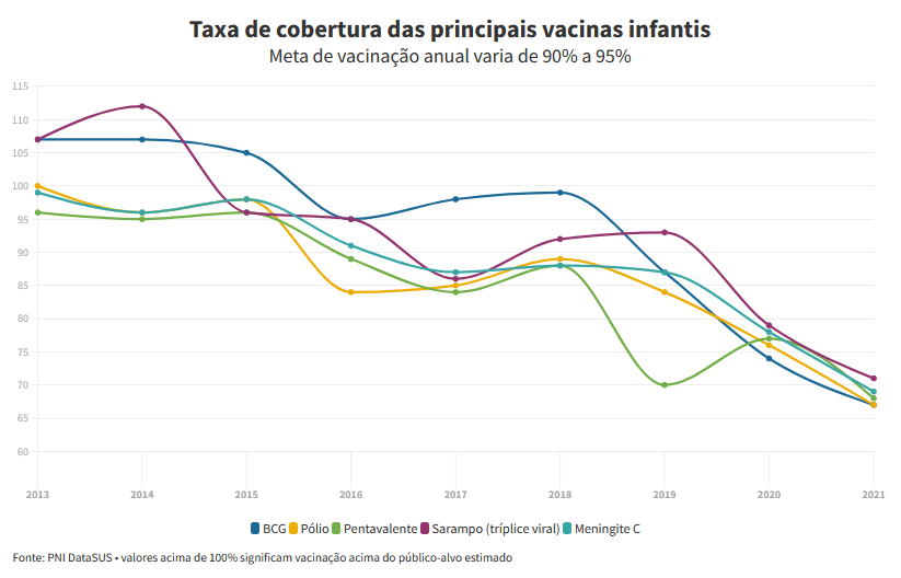 A partir do dia 4 de abril, começa a Campanha Nacional contra o Sarampo de 2022, junto com a campanha contra a Influenza, com foco nas crianças. Será uma chance para começar a reverter a crise de queda histórica na aplicação das vacinas do calendário infantil. Desde 2016, após o ápice da cobertura de imunização, a queda aumenta – e se agrava a partir de 2019: hoje, o Brasil vive com a pior taxa em mais de 30 anos, critica Isabella Ballalai, vice-presidente da Sociedade Brasileira de Imunizações (SBIm). Um fato é que a urgência da pandemia transferiu os esforços da Saúde para priorizar o combate ao vírus, e prejudicou as demais campanhas. Mas dados inéditos obtidos por uma investigação da Repórter Brasil revelam que o ministério da Saúde empurrou o país ao abismo.