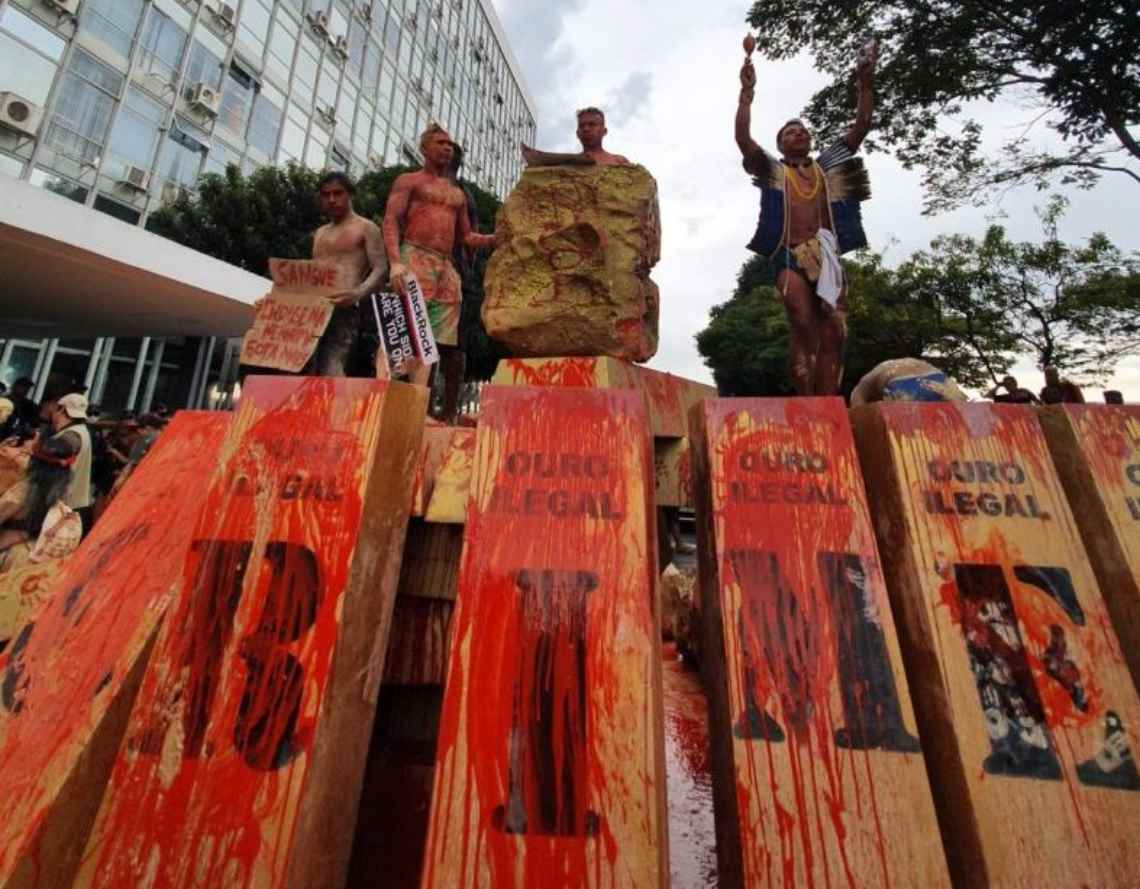 Os indígenas jogaram lama, tinta vermelha e deixaram placas que lembravam barras de ouro em frente ao Ministério de Minas e Energias (MME), cuja competência envolve a exploração, a produção e o comércio de minérios no Brasil.