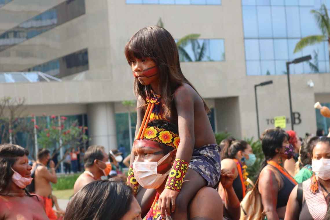 No cartaz: Luiz Gustavo Kovi Paté, criança do povo Xokleng, durante marcha contra o marco temporal, em setembro de 2021, em Brasília. Foto: Cícero Bezerra