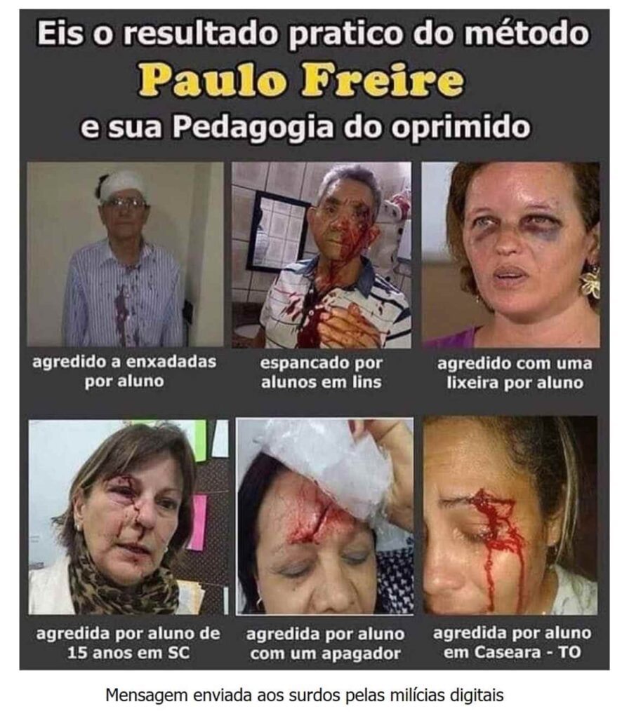 – “Nenhum verdadeiro católico deve apoiar, em hipótese alguma, a bandeira vermelha do comunismo petista” – ordena uma das mensagens repassada para fora do grupo por alguns surdos aprisionados na bolha da intransigência e da cegueira. Outra imagem impublicável exibe Cristo crucificado com uma mulher seminua, agachada de quatro diante dele, com a pergunta: “Como considerar isso como arte, cadê o respeito à religião?”. Uma legenda atribui aos comunistas a autoria da obra. Também culpa a pedagogia do oprimido de Paulo Freire por pretensas agressões de alunos a seus professores.