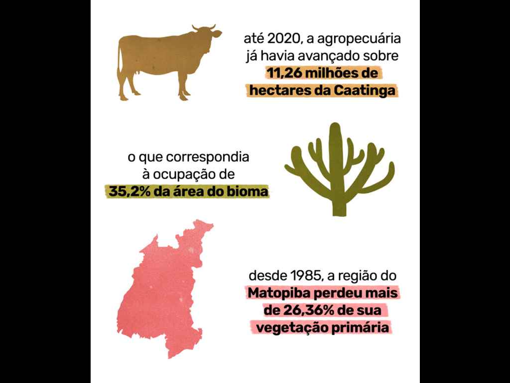 Dados do Mapeamento Anual da Cobertura de Terra no Brasil, do MapBiomas, mostram que, até 2020, a agropecuária já havia avançado sobre 11,26 milhões de hectares da Caatinga e respondia pela ocupação de 35,2% da área do bioma. Em paralelo, desde 1985, a região perdeu mais de um quarto (26,36%) de sua vegetação primária.