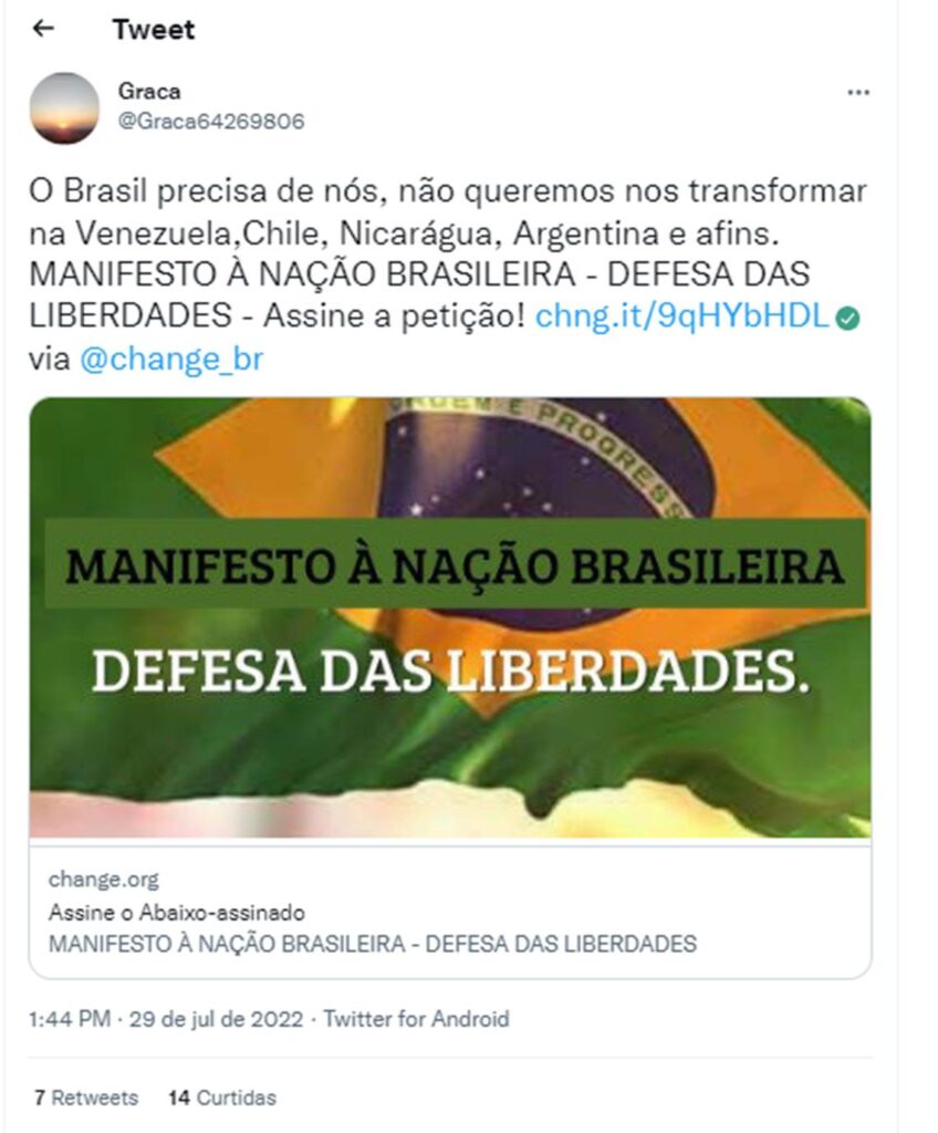 “Em apoio à nossa liberdade e ao presidente @jairbolsonaro”, escreveu em 28 de julho ao compartilhar o link da petição. No dia seguinte, fez outro tuíte: “O Brasil precisa de nós, não queremos nos transformar na Venezuela, Chile, Nicarágua, Argentina e afins”, escreveu, copiando novamente o link para o abaixo-assinado.