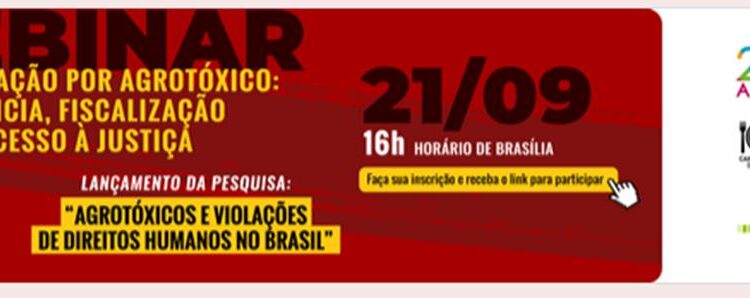 Você sabe quais direitos são violados ou como é possível denunciar uma violação de direitos por conta da contaminação por agrotóxicos? É para garantir que mais pessoas tenham conhecimento de seus direitos e dos mecanismos de denúncia que a Campanha Permanente Contra os Agrotóxicos e Pela Vida e a Terra de Direitos realizam no próximo dia 21 de setembro, às 16h do horário de Brasília, o webinar Contaminação por Agrotóxico: denúncia, fiscalização e acesso à justiça.