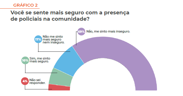 Quando perguntados sobre se sentirem ou não mais seguros com a presença de policiais na comunidade, apenas 10% dos entrevistados responderam que se sentiam mais seguros e 69% responderam que se sentiam mais inseguros. Temos, portanto, que uma política de Estado que se propunha a oferecer segurança à população do bairro teve o efeito contrário de contribuir para o aumento da sensação de segurança entre os moradores. Abaixo o gráfico com a distribuição das respostas a esta pergunta: