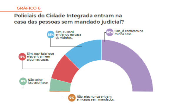 A referida percepção de insegurança por parte da população se deve em boa medida às tão frequentes experiências de abuso sofridas por moradores desde o início da ocupação pela Polícia Militar. Dentre essas experiências, destaca-se a invasão de residências por policiais sem mandado judicial. Como mostra o gráfico abaixo, metade dos 387 moradores entrevistados tiveram as suas residências ilegalmente invadidas por policiais, 25% testemunharam invasões a outras casas e 17% ouviram falar que isso acontece. Vale lembrar que não há nenhuma previsão legal que permita à polícia invadir e revistar residências particulares sem mandado judicial.