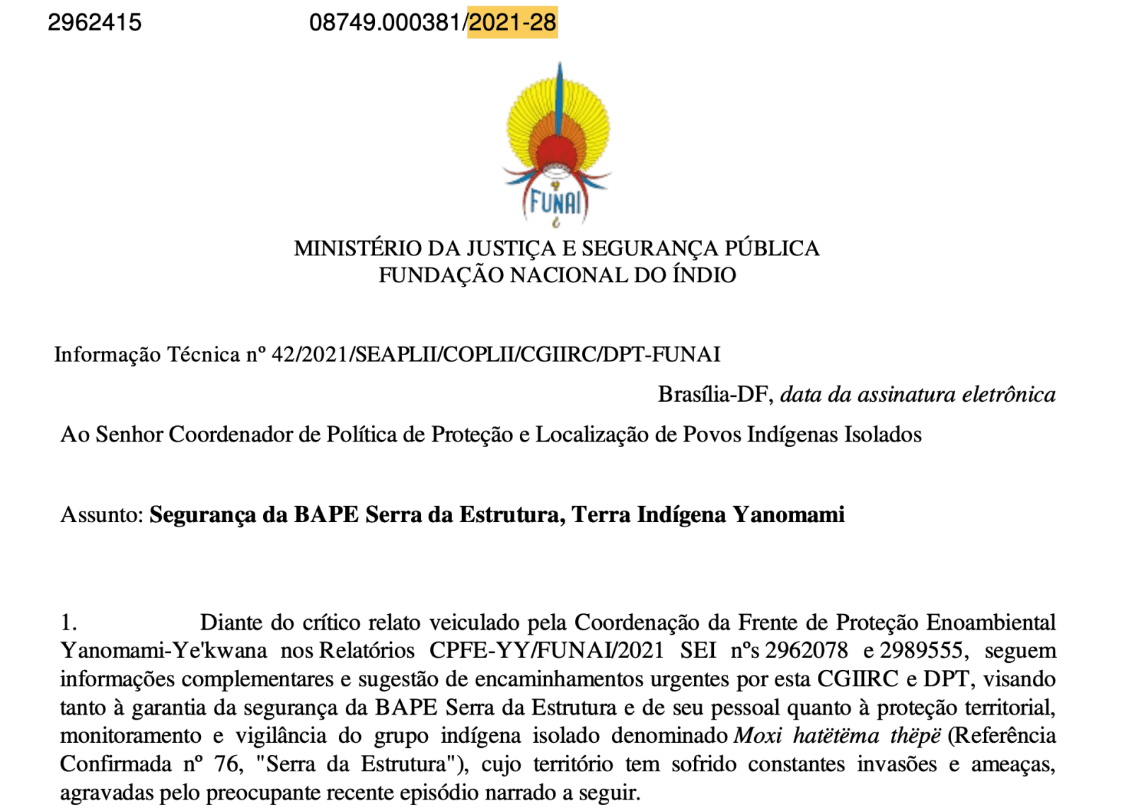 O documento informa ainda que ofícios foram encaminhados às instituições de segurança pública e fiscalização ambiental para lidarem com a situação. O próprio registro da Funai informa que a movimentação de aeronaves e garimpeiros nas proximidades da BAPE Serra da Estrutura “tem aumentado de intensidade o que representa risco aos servidores e colaboradores da BAPE”. O documento ainda revela que os invasores têm “circulado armados nas proximidades da BAPE e tentado aliciar funcionários da Funai”. Fontes ouvidas pela reportagem disseram que a ajuda nunca veio.