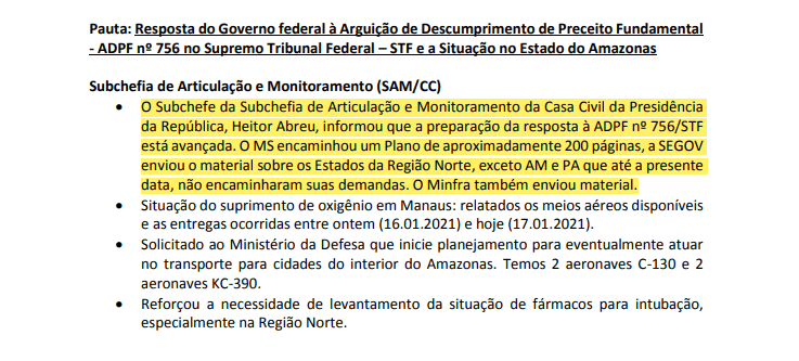 O encontro revela ainda que não havia um plano de atendimento, pelas Forças Armadas, para outros municípios amazonenses, pois o representante da SAM informa ter “solicitado ao Ministério da Defesa que inicie o planejamento para eventualmente atuar no transporte para cidades no interior do Amazonas”. A SAM informou ainda que a preparação da resposta para a ADPF estava “avançada”, e enfim o MS “encaminhou um Plano de aproximadamente 200 páginas”.