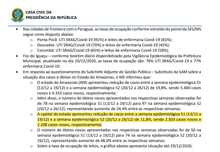 Somente no dia 30, a pedido do Subchefe Adjunto de Gestão Pública, o Ministério da Saúde informou ao comitê os números de óbitos e de contaminação no Estado do Amazonas, mas continuou escondendo o que acontecia na capital. O órgão não só omitiu o crescimento de internados, como os dados apresentados sobre Manaus davam a impressão de que a situação estava sob controle, com a redução de contaminações no município: “A capital do estado (Amazonas) apresentou redução de casos entre a semana epidemiológica 51 (13/12 a 19/12) e a semana epidemiológica 52 (20/12 a 26/12) de 11,8%, sendo 2.503 casos novos e 2.208 casos novos, respectivamente”, mas o número de  óbitos, também registrados, haviam aumentado em 48%, passando de 50 para 74.
