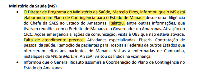Ainda assim, na reunião do CCOP de 16 de janeiro, o então diretor de Programa do Ministério da Saúde, Marcelo Pires, relatou que, entre os problemas identificados pelo ministério estava a “falta de atendimento precoce” no município de Manaus.