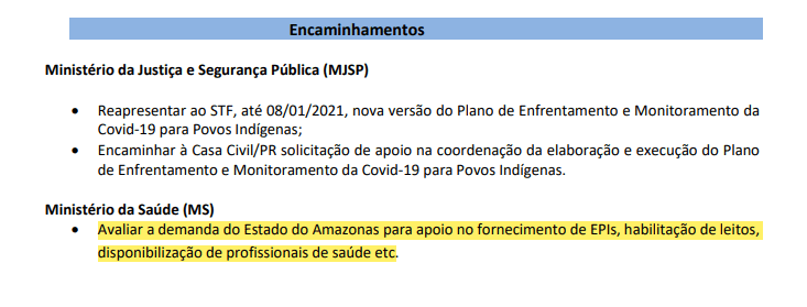 Na reunião do comitê de crise realizada naquele 30 de dezembro, o representante da Secretaria de Governo também relatou que o estado do Amazonas “havia pedido apoio no fornecimento de EPIs, habilitação de leitos, disponibilização de profissionais de saúde etc” e que esta demanda havia sido repassada ao Ministério da Saúde e à Subchefia de Articulação e Monitoramento da Casa Civil da Presidência da República (SAM). Ao término do encontro – que durou menos de 30 minutos – ficou decidido que a Saúde deveria apenas “avaliar a demanda” do Amazonas.