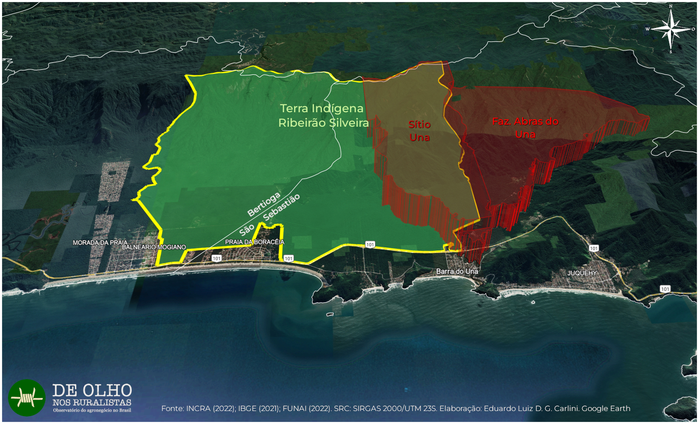 A demanda judicial foi movida por Armando Jorge Peralta, outro empresário do setor imobiliário da Baixada Santista. A transferência do caso dos búfalos para Justiça Estadual não se justifica, já que as sobreposições acontecem levando em conta o tamanho atual da Terra Indígena. São pelo menos 20,59 hectares invadidos. Caso seja considerada a ampliação declarada em 2008, a sobreposição é de 2.149,98 hectares, conforme mostramos no mapa abaixo.