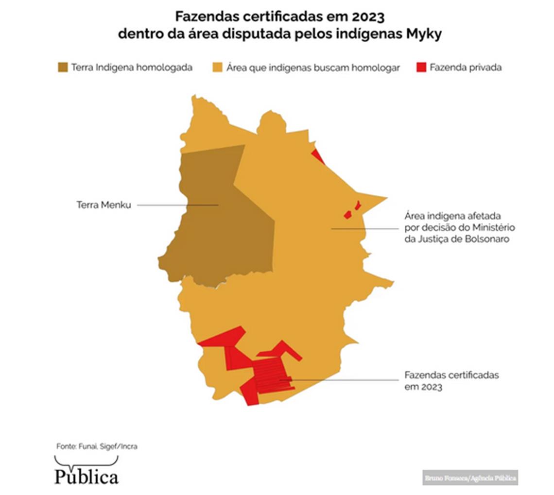 Parte da terra Menku já está homologada desde 1987, mas o processo foi questionado pelo povo Myky, que aguarda há anos um reestudo que pode adicionar mais 146 mil hectares ao território, atualmente de 47 mil hectares — é nessa área que estão as fazendas certificadas em 2023.