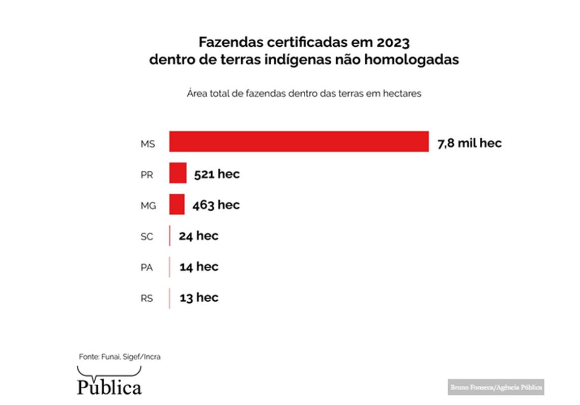 Além do Mato Grosso do Sul, a reportagem encontrou fazendas que foram certificadas em terras indígenas em 2023 nos estados do Paraná, Minas Gerais, Santa Catarina, Pará e Rio Grande do Sul.