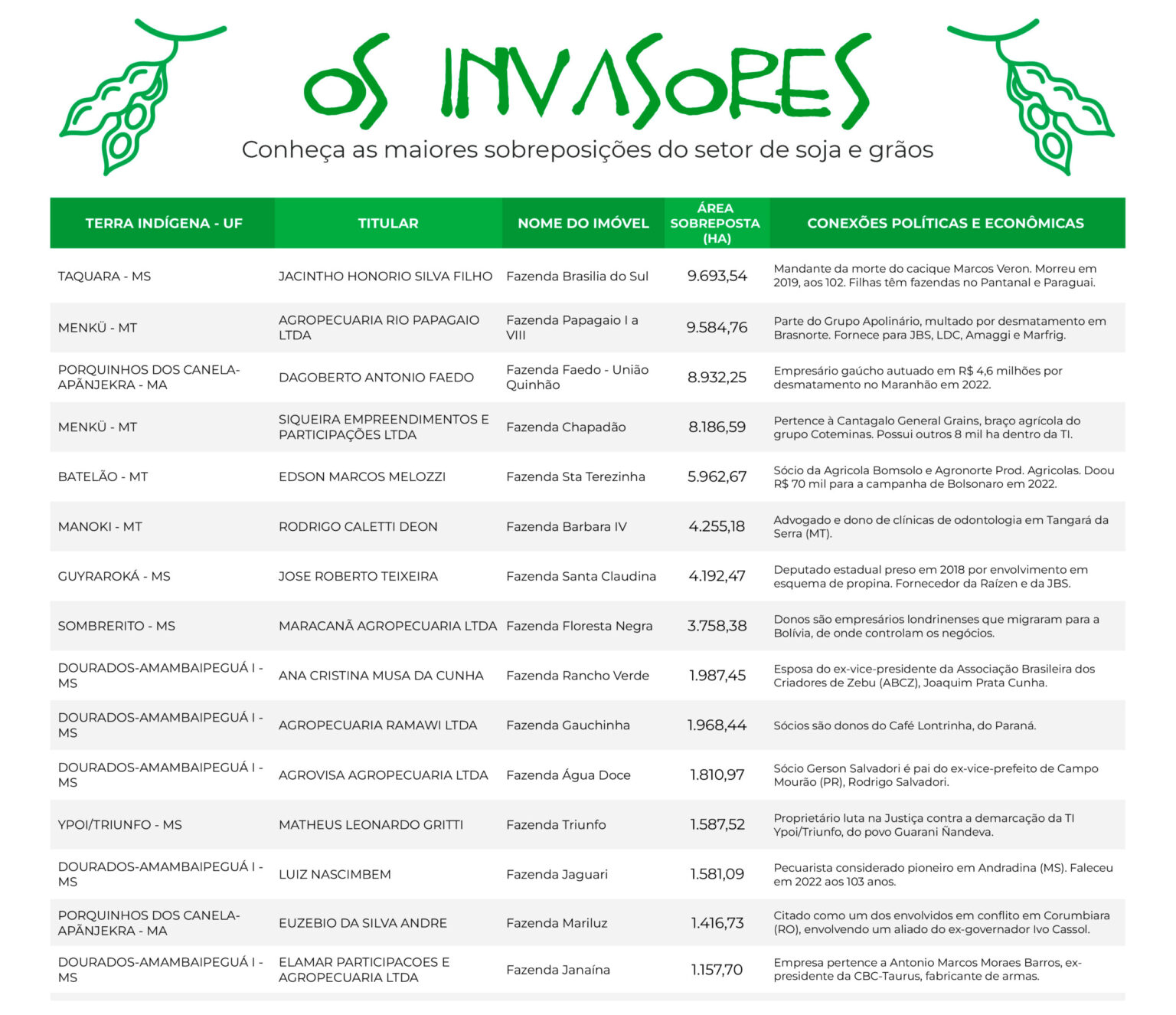 Confira abaixo, na tabela, as propriedades de sojeiros com maior incidência em terras indígenas: