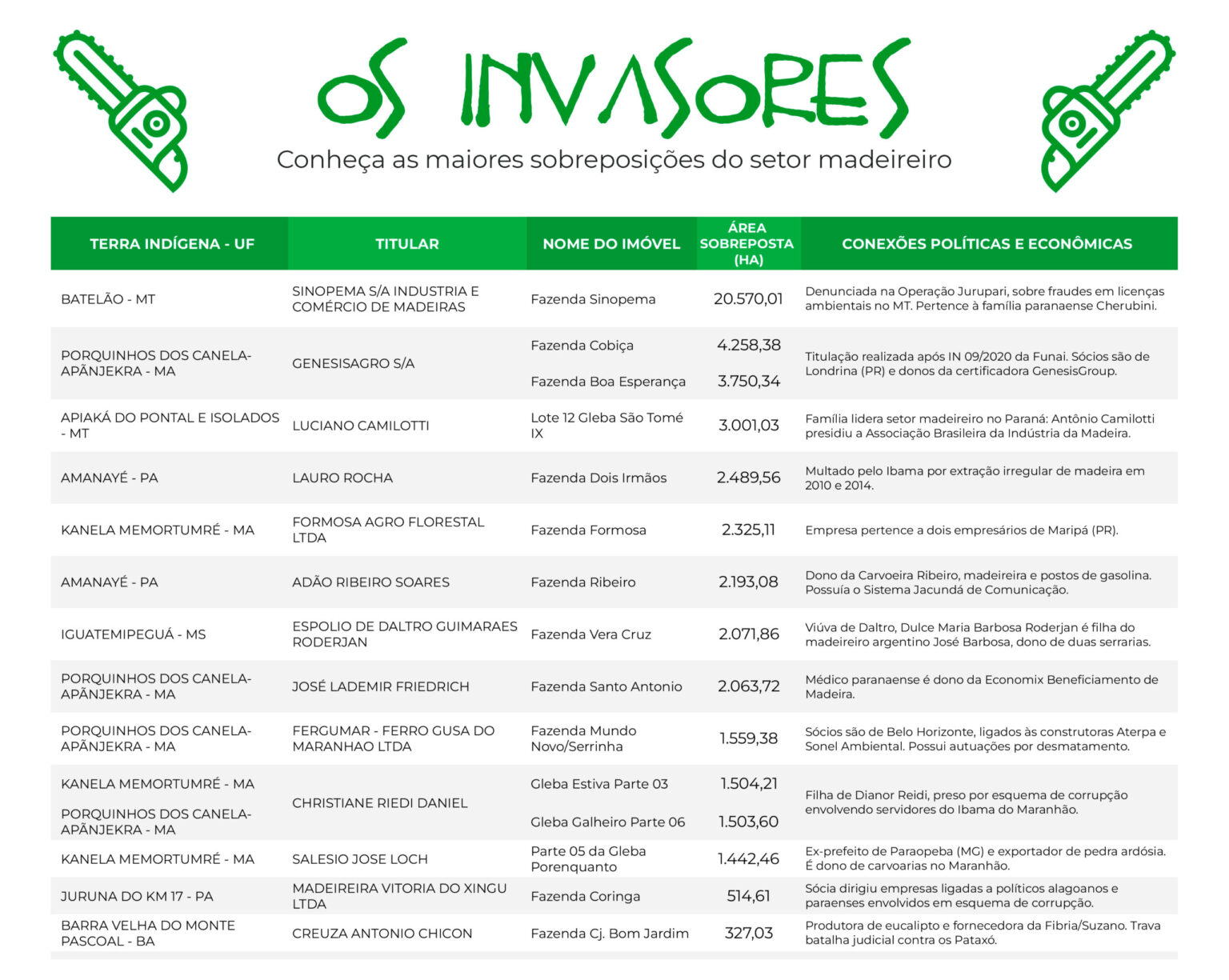 O setor é um dos destaques do relatório “Os Invasores: quem são os empresários brasileiros e estrangeiros com mais sobreposições em terras indígenas”, publicado na última quarta-feira (19) pelo De Olho nos Ruralistas. Com base nos dados fundiários do Instituto Nacional de Colonização e Reforma Agrária (Incra), o estudo identificou pelo menos quinze grandes incidências de empresários do ramo madeireiro em terras indígenas demarcadas pela Funai no Mato Grosso, Maranhão, Pará e Bahia.