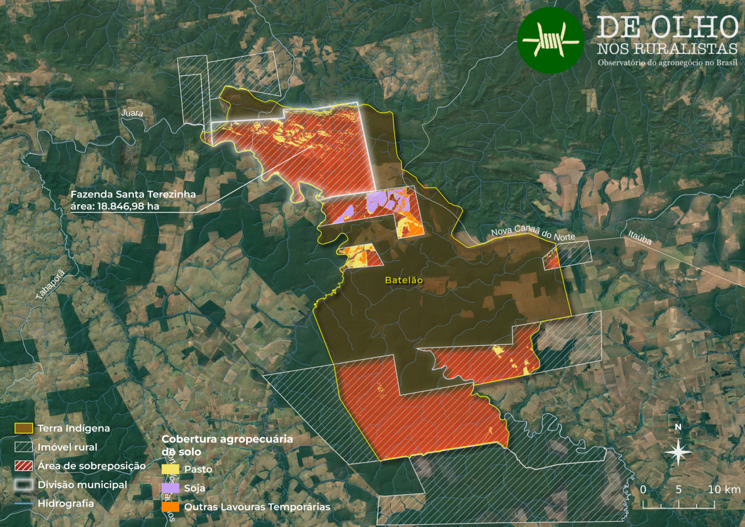 Declarada em 2007, a TI Batelão teve o processo demarcatório suspenso por liminar poucos meses depois, em 2008. Os Kaiabi reivindicam 117 mil hectares de seu território ancestral em sua maioria no município de Tabaporã (MT) e regiões limítrofes de Juara e Nova Canaã do Norte. A fazenda de Mario Junior representa 15% dessa área.