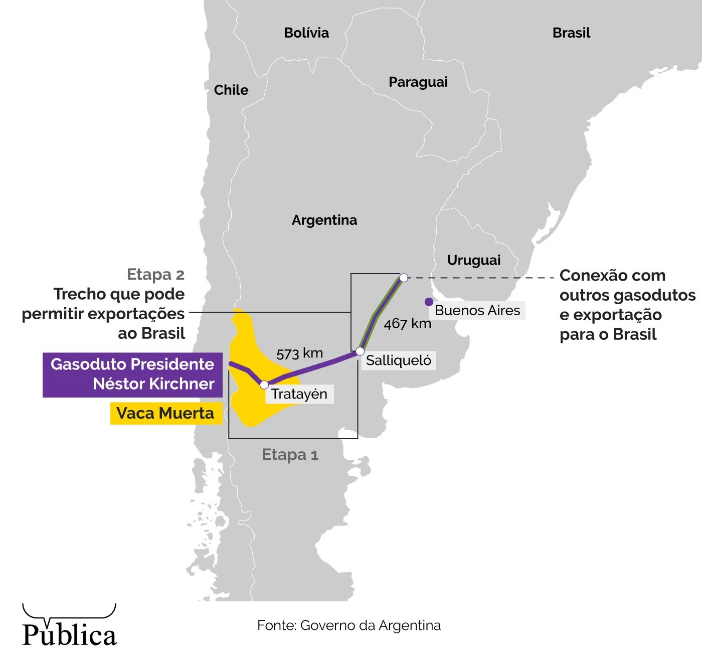 O governo brasileiro pode apoiar a construção do segundo trecho do gasoduto Presidente Néstor Kirchner, que possibilitará a exportação ao Brasil do gás produzido na região conhecida como Vaca Muerta, na patagônia argentina. Lá, o gás e o petróleo não convencionais são extraídos por meio do fraturamento hidráulico, mais conhecido como fracking. A técnica, já banida em vários países, é relacionada por estudos científicos a graves impactos ambientais e riscos à saúde humana (veja box abaixo).