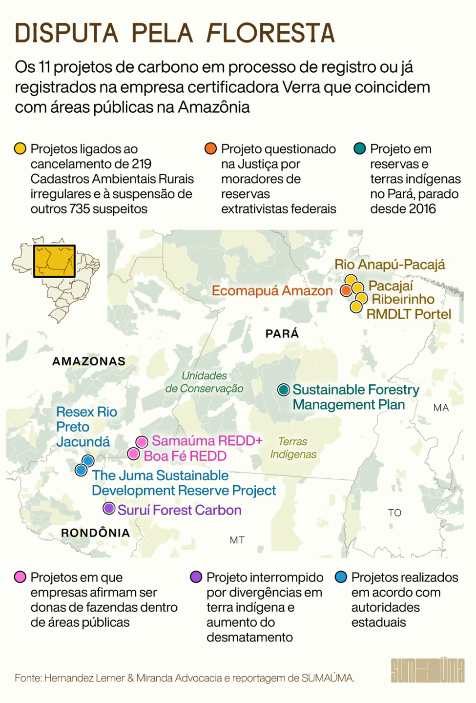 A partir dos nomes dos empreendimentos, de sua localização e de seus proponentes, um cruzamento de informações feito por SUMAÚMA identificou, na lista de 11, dois projetos na região de Apuí, no sul do Amazonas, em que empresas privadas afirmam ser donas de terras que aparecem nos mapas de três unidades de conservação estaduais e de um assentamento federal. Isso significa que particulares podem estar tentando vender carbono em três terras públicas protegidas para a conservação da floresta e uma quarta destinada à reforma agrária.