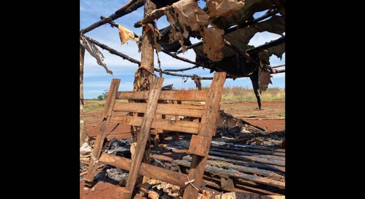 Casa incendiada por pistoleiros no ekoha Avae’te, em Dourados (MS), do povo Guarani e Kaiowá. Foto: comunidade do tekoha Avae’te