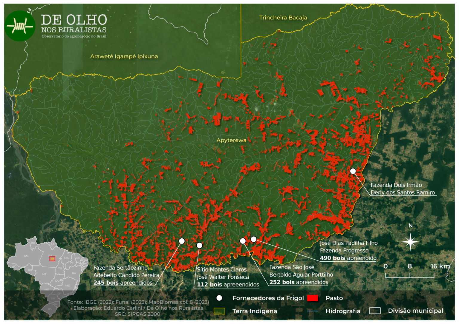 A partir da análise das coordenadas geográficas e dos números de registro de fazendas apontadas no relatório do MPF, De Olho nos Ruralistas identificou os nomes de cinco pecuaristas que forneceram gado à Frigol entre 2012 e 2015. Juntos, eles tiveram 1.099 animais apreendidos pelo Ibama, como parte da força-tarefa iniciada em setembro.
