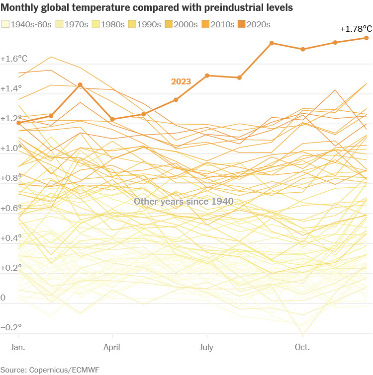 No segundo semestre de 2023, começava a soar repetitiva a notícia de que o mês anterior havia sido o mais quente desde que há registro. Mas mesmo após as imagens de queimadas mundo afora e as fortes ondas de calor que atravessaram também o Brasil, observar o gráfico publicado no jornal New York Times ontem chega a espantar.