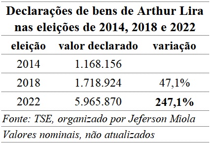 A declaração de bens do Lira à justiça eleitoral mostra um crescimento de 247,1% dos bens dele em 2022 em comparação com 2018 – multiplicou o patrimônio em quase quatro vezes, conforme mostra a tabela.