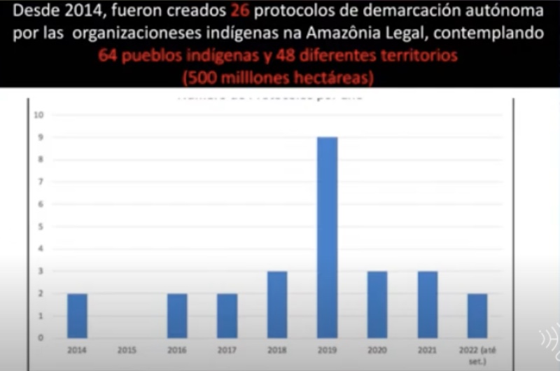 O gráfico abaixo mostra este processo de autonomia começado em 2014. Sem dúvida, o avanço do agronegócio é a causa fundamental da proposta. Existem 26 protocolos de demarcação autônoma envolvendo 64 povos em 48 territórios diferentes – porque alguns povos compartilham territórios. Essa é uma pequena demonstração de que esse processo está acontecendo na Amazônia brasileira agora mesmo. A série histórica, no gráfico, vai até 2022. No total, 64 povos, dos 300, estão nesse processo de demarcação autônoma.