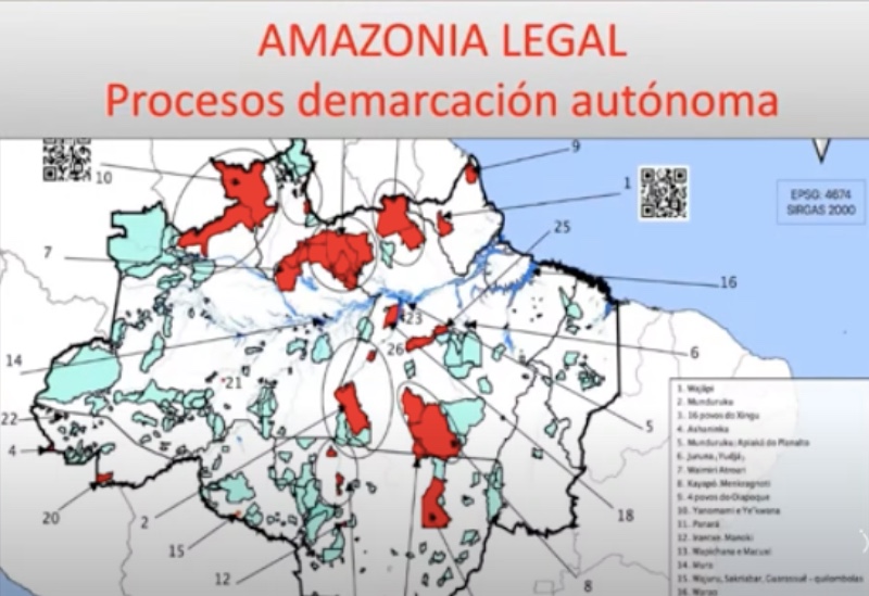 O primeiro mapa (abaixo) é da região da Amazônia Legal brasileira. Ele foi criado pelo pesquisador brasileiro Fábio Alkmin, que pesquisa processos de demarcação autônoma neste país. As áreas em azul claro indicam as zonas dos povos originários, que são trezentos. As áreas em vermelho indicam os povos que decidiram, em assembleia, com suas autoridades, realizar a demarcação autônoma dos territórios, uma vez que a Constituição brasileira, mais de trinta anos atrás, ordenou a demarcação dos territórios dos povos, mas a demarcação ainda não foi efetivada em muitos casos. Por essa razão, esses povos começaram um processo de demarcação autônoma. Isso implica a afirmação do território e a criação de guardas de autodefesa não armadas para impedir que grileiros utilizem o território.