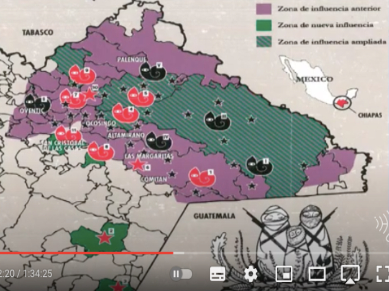 Este outro mapa (abaixo) indica a zona das autonomias zapatistas no México. O território em roxo é o antigo território de autonomia zapatista, e os territórios em verde são os municípios absorvidos em uma nova etapa. Aqui, interessa assinalar o território zapatista de Chiapas, que é heterogêneo e equivale à superfície de um país pequeno como El Salvador. Insisto: isso não é marginal. Nem todas as famílias dentro do território zapatista são zapatistas. O que quero salientar é que essas são regiões onde existe uma força zapatista presente e a simpatia da população é maior ou menor, segundo o momento político de cada um.