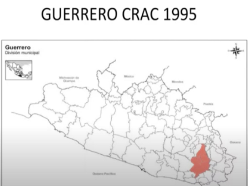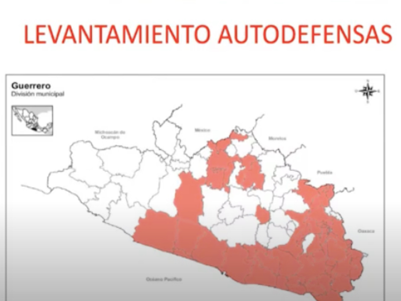 Nos mapas abaixo, mostro um processo interessante ocorrido no estado mexicano de Guerrero. Em 1995, foi criada a polícia comunitária de Guerrero. Com esses mapas quero mostrar como pequenas iniciativas podem se expandir. Inicialmente, a polícia comunitária foi criada somente em quatro municípios de Guerrero. Em 2011, esta polícia se expandiu. O estado atravessava uma grande crise de segurança, e a experiência que começou em quatro municípios foi vista, por outros municípios, como um bom caminho. Em 2012, a experiência cresceu ainda mais e, no ano seguinte, houve a expansão das autodefesas. Isto mostra que experiências minoritárias bem-sucedidas podem ser generalizadas.