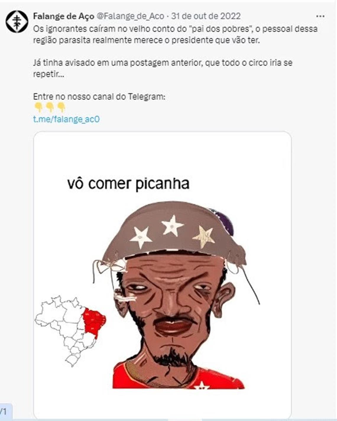 Na rede X, o grupo nacionalista branco, que defende a seperação do Sul do restante do país, Falanges de Aço, faz postagens racistas e xenofóbicas contra nordestinos. Eles espalham cartazes com mensagens de ódio pelas ruas de Porto Alegre e, em novembro de 2022, participaram de manifestações antidemocráticas que reuniram bolsonaristas na capital do Rio Grande do Sul.