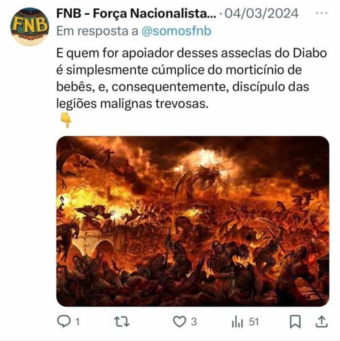 Publicação da Força Nacionalista no X relaciona mulheres pró-aborto a “cúmplices do morticínio de bebês”