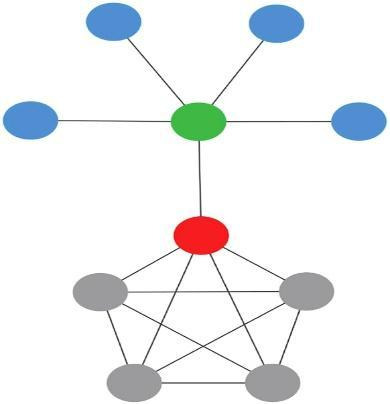 No presente artigo, aplicamos a Análise de Redes Sociais (ARS) no nível do território brasileiro, além de inovarmos com um indicador sociométrico a mais (centralidade de intermediação), não empregado no estudo de Vitali (nota 9). Com esse fim, fizemos uso de estatísticas relacionais para medirmos e entendermos a economia corporativa modelada em rede, bem como para a visualização de sua topologia. Dessa forma, são três, essencialmente, as métricas aplicadas10: grau de saída, grau de saída ponderado e centralidade de intermediação. O grau de saída mede a quantidade de conexões que parte de cada nó de uma rede para outro(s); o grau de saída ponderado faz o mesmo, considerando o peso de cada conexão; a centralidade de intermediação calcula a capacidade que em uma rede o nó tem de ligar outros nós e até subgrupos, servindo como ponte. Todos esses três índices mediram o controle acionário da rede corporativa em território brasileiro composta pelos já mencionados 7.257 vínculos, pertinentes a cada uma das 6.235 unidades empresariais encontradas em nosso estudo. É importante sublinhar que os graus de saída fazem menção ao controle acionário direto de cada nó e a centralidade de intermediação consegue captar o controle indireto na medida em que identifica os nós-ponte. No exemplo abaixo, caso o nó central (no meio do grafo), deixe a rede ou perca uma conexão, a própria rede em si deixa de existir. Tal hipótese ilustra o potencial da centralidade de intermediação.