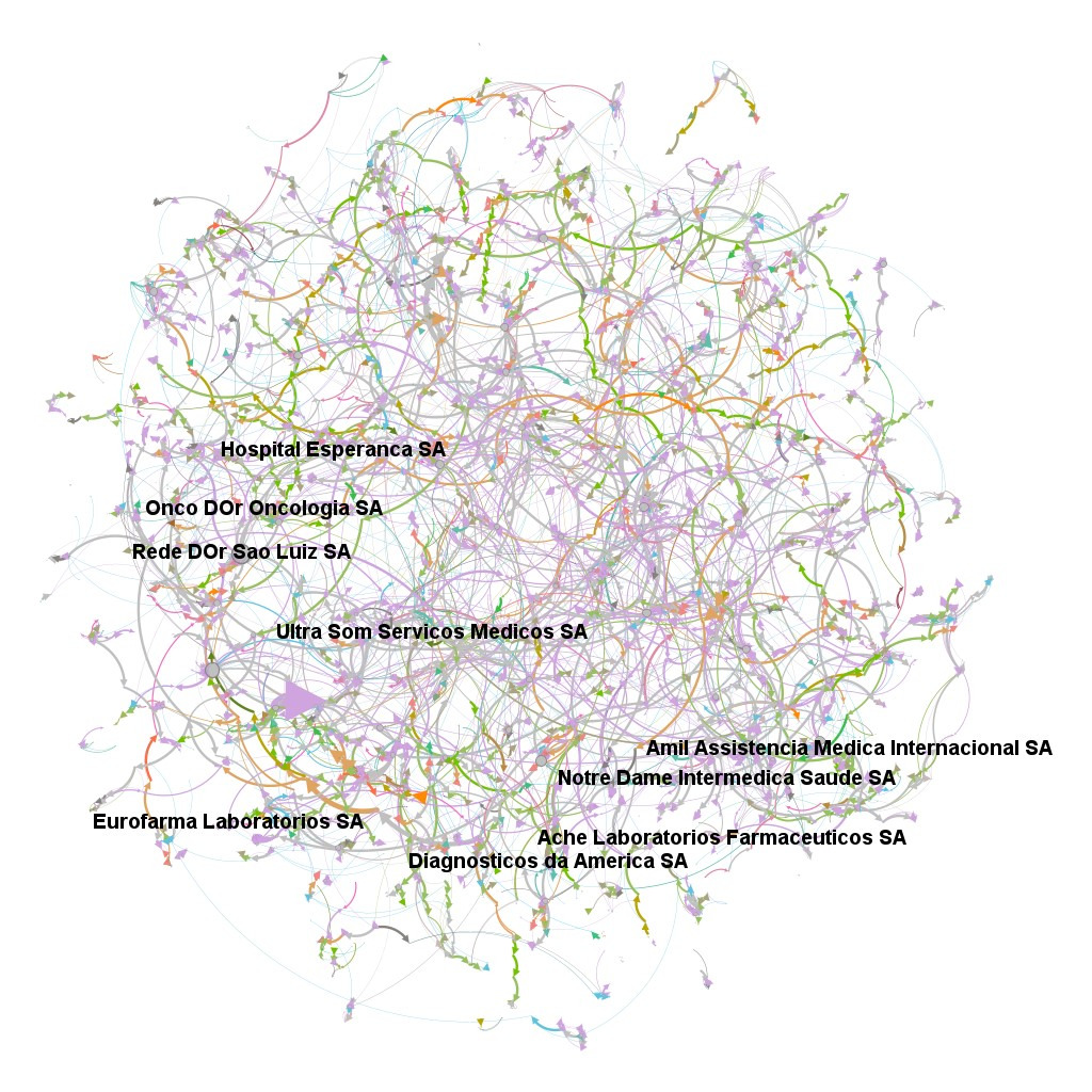 No Brasil, uma das surpresas foi a descoberta de que o setor mais poderoso, sempre sob o ponto de vista do controle acionário em rede, é o de energia elétrica, sendo a principal empresa a Eletrobrás, agora controlada pelo trio LST (os bilionários Lemann, Sicupira e Telles). Outra surpresa foi constatar que o setor de intermediação financeira, os bancos, não estão em primeiro lugar, mas em segundo, o que é não uma posição desprezível. Na sequência de surpresas, verificamos que o setor de Saúde Privada está entre os primeiros mais poderosos na economia corporativa brasileira, que representa 63,5% do PIB. São 200 holdings que significam apenas 0,03% dos CNPJs ativos. Nessa elite das 200 corporações há grupos ainda mais privilegiados. O primeiro nível de concentração dessa rede de 6.235 empresas (que compõem as 200 holdings) é constatado quando vemos que apenas 20% delas (1.247 empresas) controlam 80% (5.820) de todas as conexões acionárias da rede (7.257). E a concentração continua: 1% (um por cento: 62 corporações ou holdings) das 6.235 empresas, dos 200 grupos, controla quase ¼ (21,7%) de toda a rede, de todas as 7.257 conexões acionárias. O presente artigo, sob essa lógica, busca entender a importância e o papel da saúde privada.