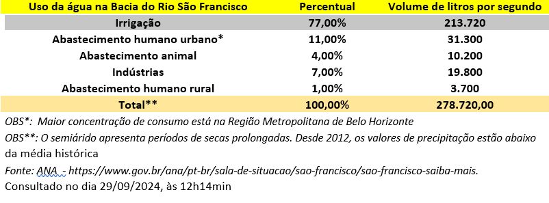 Segundo a Agência Nacional das Águas e Saneamento Básico (ANA), os principais usos de água na Bacia do rio São Francisco são irrigação (77%) e abastecimento humano (12%). Vale ressaltar que os irrigantes gastam seis vezes mais água do que a população de 512 municípios de seis estados abastecidos pelo São Francisco.