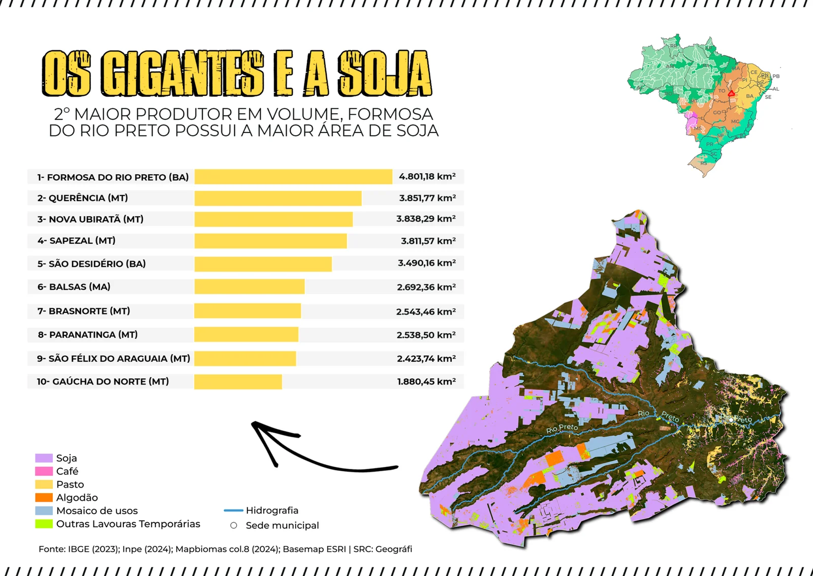 Palco da Operação Faroeste e dos conflitos envolvendo o Condomínio Agrícola Cachoeira Estrondo, Formosa do Rio Preto possui a maior área de soja entre os Gigantes. São 4.801,18 km² dedicados à monocultura do grão, quase um terço da área total do município, um dos principais beneficiários da Ferrovia de Integração Oeste-Leste (Fiol).