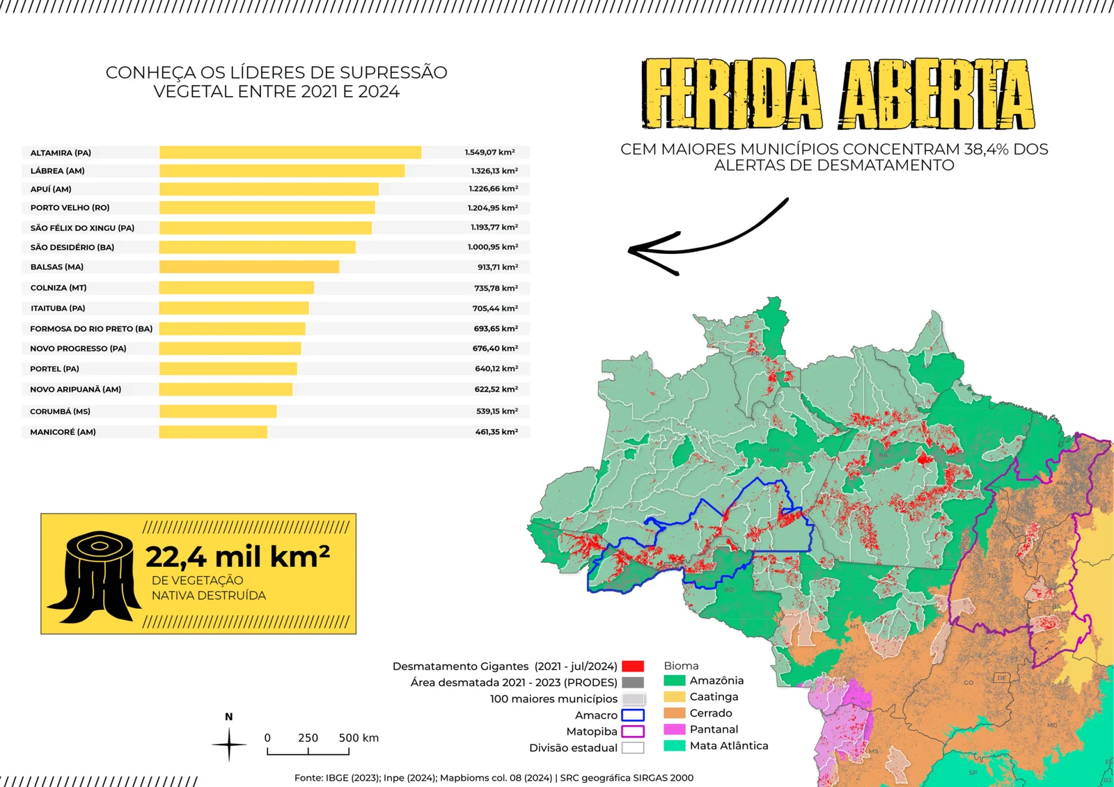 Os três representantes do Matopiba figuram na lista dos dez municípios que mais perderam vegetação entre os cem maiores do Brasil entre 2021 e 2024. Juntos, Balsas, São Desidério e Formosa do Rio Preto desmataram 2.608,31 km², 30% do total do Matopiba.