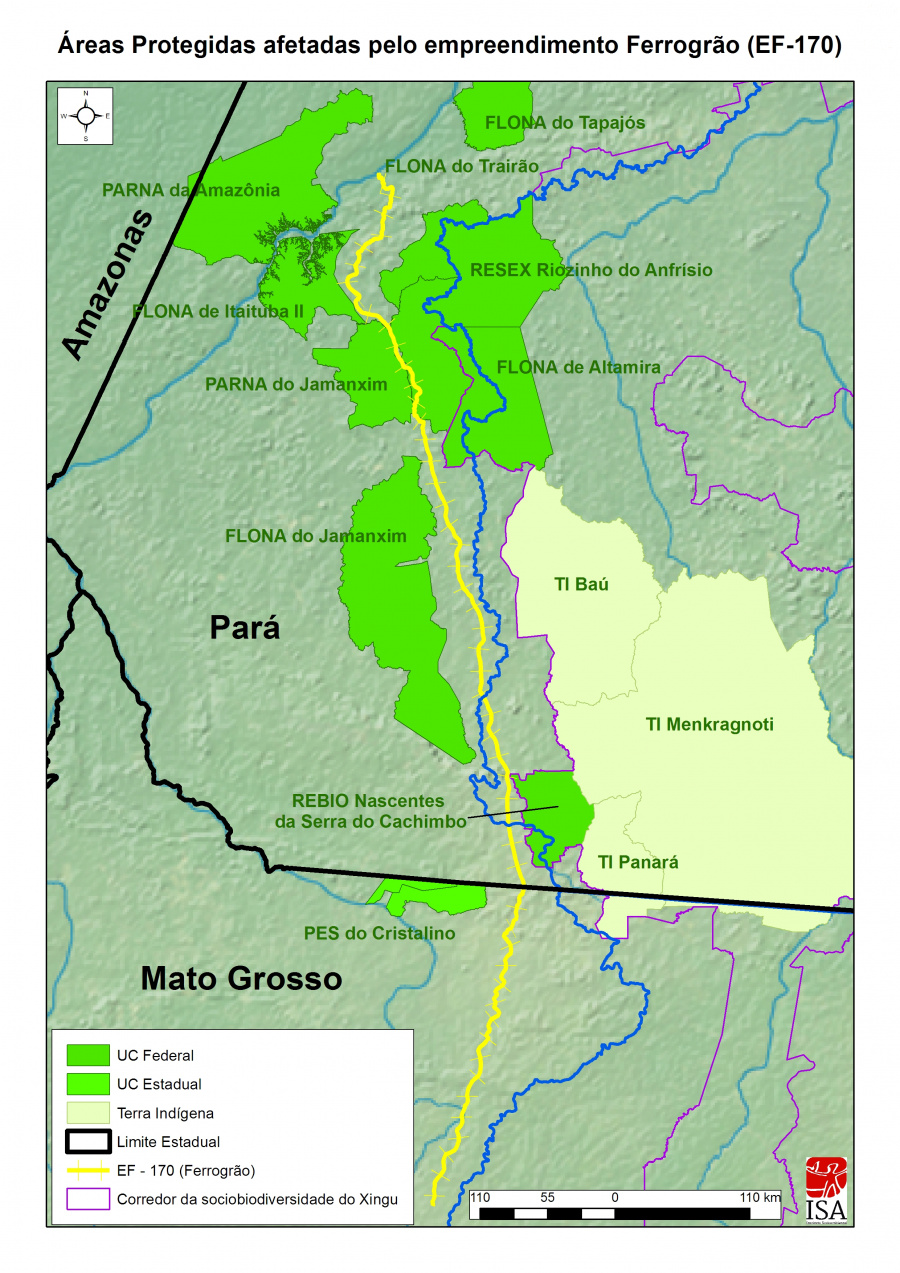 Em seu projeto, o trajeto da ferrovia (em linha amarela) pretende cortar terras indígenas e unidades de conservação. Fonte: Instituto Socioambiental