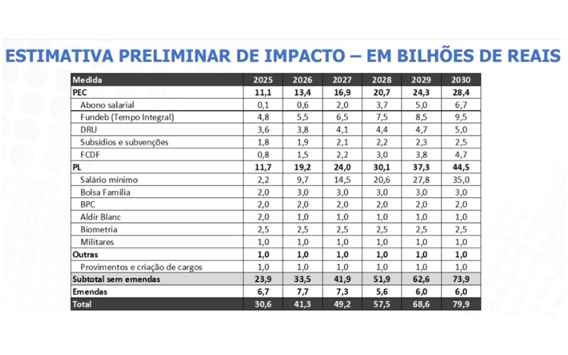 A redução de gastos sociais resultante das medidas desse pacote, que recai principalmente sobre as pessoas mais vulneráveis, deve ser de R$ 30,6 bilhões já em 2025, segundo anunciado pelo governo, e seguirá aumentando nos anos seguintes, conforme tabela divulgada pelo próprio governo (ver abaixo), somando R$ 327,1 bilhões até 2030, dos quais R$ 109,8 bilhões sairão do salário mínimo.