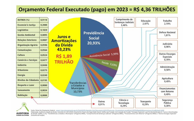 De fato, temos afirmado que o rombo das contas públicas está nos gastos com o sistema da dívida, tendo em vista que nos seus 24 anos de luta a Auditoria Cidadã da Dívida tem comprovado isso. Anualmente, produzimos o gráfico do orçamento federal, denunciando o privilégio do Sistema da Dívida: