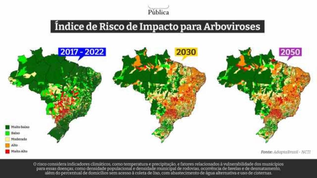 Para 2030, caso a temperatura média do planeta continue aumentando, 50% dos municípios passam a apresentar risco alto ou muito alto das arboviroses transmitidas pelo Aedes aegypti, de acordo com a estimativa antecipada, com exclusividade, à Agência Pública. Em 2050, serão quase 53% dos municípios.