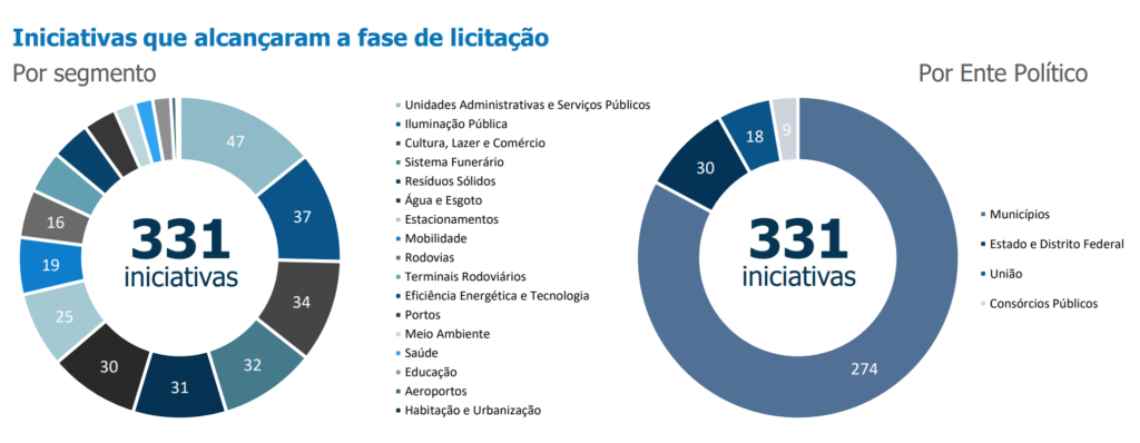 Apenas ao longo do ano passado foram registradas 555 novas iniciativas de PPPs e concessões captadas pelo radar organizado pela empresa. Deste total, 331 foram iniciativas que avançaram para a fase de licitação. A distribuição de tais processos entre os entes federativos aponta para a esperada concentração na esfera municipal: 274 para municípios, 30 para estados, 18 para União e 9 para consórcios públicos. Os setores atingidos vão desde “unidades administrativas e serviços públicos” até serviços funerários, passando por saúde, educação, “cultura, lazer e comércio”, meio ambiente e múltiplas áreas de infraestrutura.