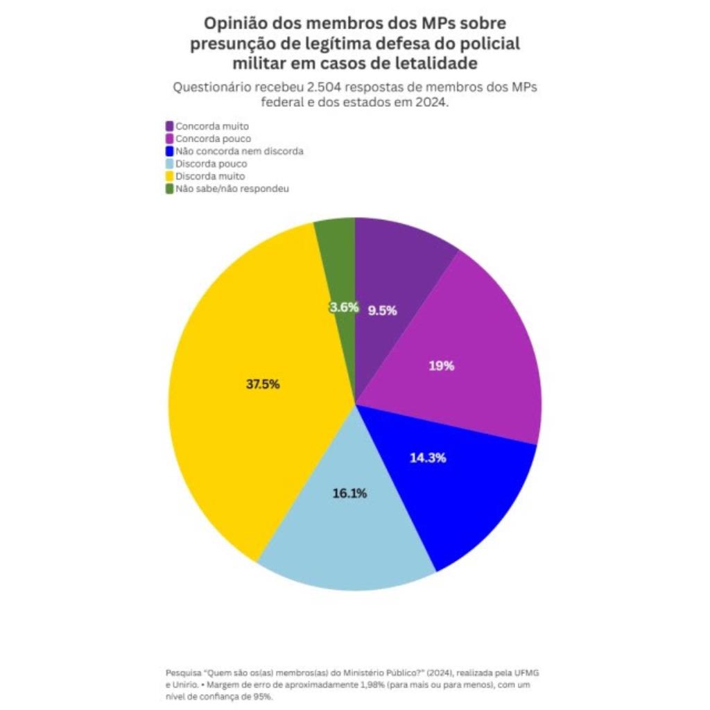 A pesquisa também questionou os promotores e procuradores sobre qual a posição deles em relação à presunção de legítima defesa do policial militar que se envolvia em mortes. Apesar de a maioria (53,6%) discordar em alguma medida, chama a atenção que quase 30% demonstram apoio parcial ou integral.
