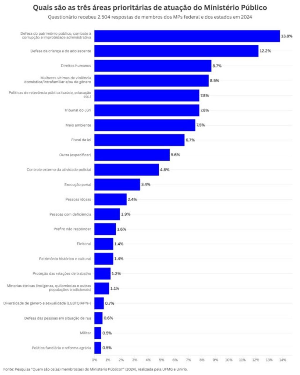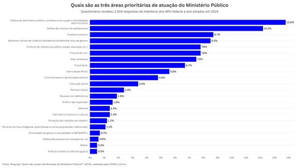 Questionados sobre quais são as três áreas prioritárias de atuação do órgão, as respostas foram defesa do patrimônio público, combate à corrupção e improbidade administrativa (13,8%), defesa da criança e do adolescente (12,2%) e direitos humanos (8,7%).