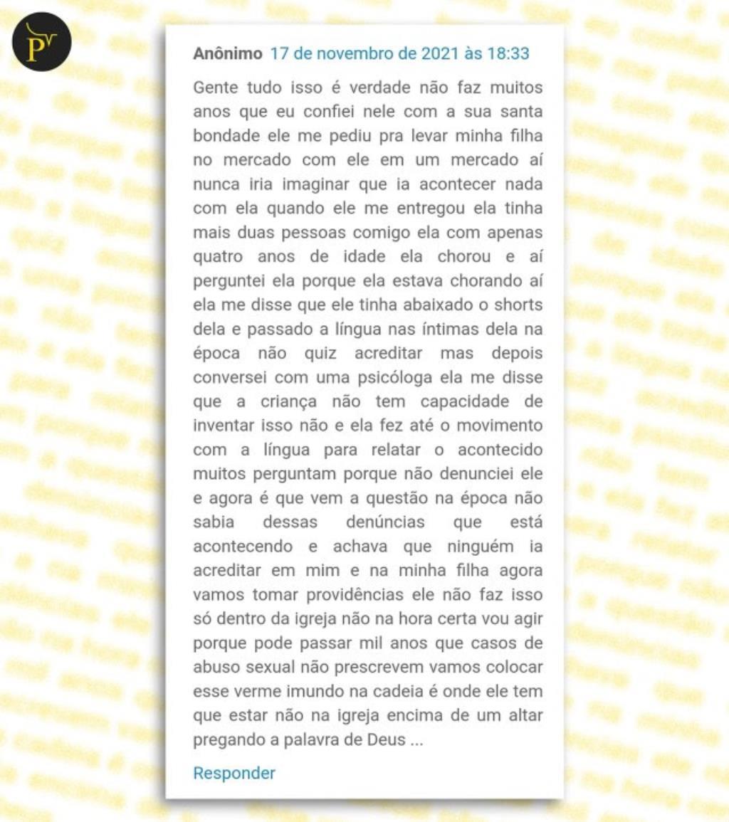 “Fui abusada sexualmente pelo padre Bernardino logo após a missa. Era época de festividades na igreja e tinham barraquinhas espalhadas pela rua. A igreja estava em obras, em um determinado momento o padre me chamou para ajudá-lo em um quartinho onde ficam os materiais de construção. Meus pais permitiram. Chegando lá, ele trancou a porta e começou a dizer que estava sendo perseguido. Colocou um papelão no chão e mandou que eu me deitasse, veio por cima de mim e começou a se esfregar sobre meu corpo. Assim que ele sentiu prazer, parou e mandou que eu saísse como se nada tivesse acontecido”.