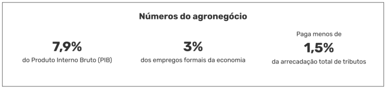Os privilégios são geralmente justificados com a propaganda de que o agronegócio sustenta o país economicamente. Os autores, no entanto, demonstram como a ideia é enganosa. O estudo aponta que, a agropecuária representa 7,9% do Produto Interno Bruto (PIB), 3% dos empregos formais da economia e paga menos de 1,5% da arrecadação total de tributos. “É o único setor que abocanha uma fatia dos benefícios tributários (13,5%) maior do que sua contribuição ao PIB”, pontuam no texto.