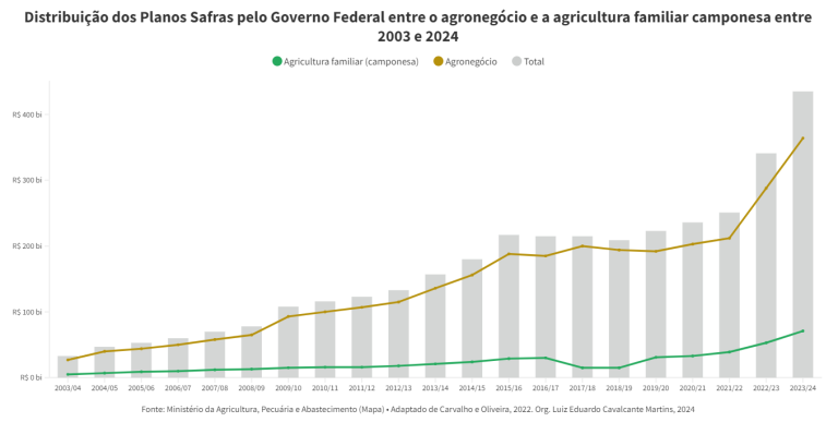 O gráfico “distribuição dos planos safras pelo governo federal” exemplifica a estratégia Robin Hood às avessas, aponta o estudo. No Plano Safra (2023/2024), foram oferecidos 435 bilhões de reais em créditos, sendo 364 bilhões para o agronegócio e somente 71 bilhões para a agricultura familiar. “O questionamento é elementar: não deveriam receber mais crédito e em melhores condições os produtores voltados ao mercado interno de alimentos?”, pontuam os autores.