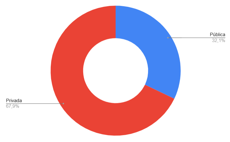 Com quase 68% de matrículas, o ensino privado prevalece como maioria. Apesar de que o setor conta com instituições com ou sem fins lucrativos, a constatação é de que o ingresso preponderante se dá mediante contrapartida financeira, o que por si só desconfigura o objetivo final, que deixa de ser o percurso formativo, passando a ser, grosso modo, a mensalidade do curso. Noutra clave, de mãos dadas com o número cada vez maior de matrículas, o número de IES no Brasil dentre os anos 2014 e 2023, mostra uma diferença na quantidade abissal entre público e privado: