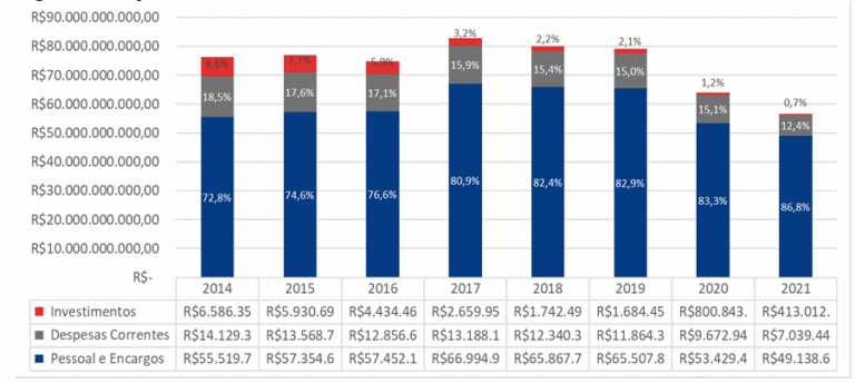 está evidenciado no aumento proporcional de gastos com pessoal e encargos, que subiram de 72,8% para 83,3% no mesmo período (embora tenham se reduzido em termos absolutos…), acompanhando a queda geral do orçamento.